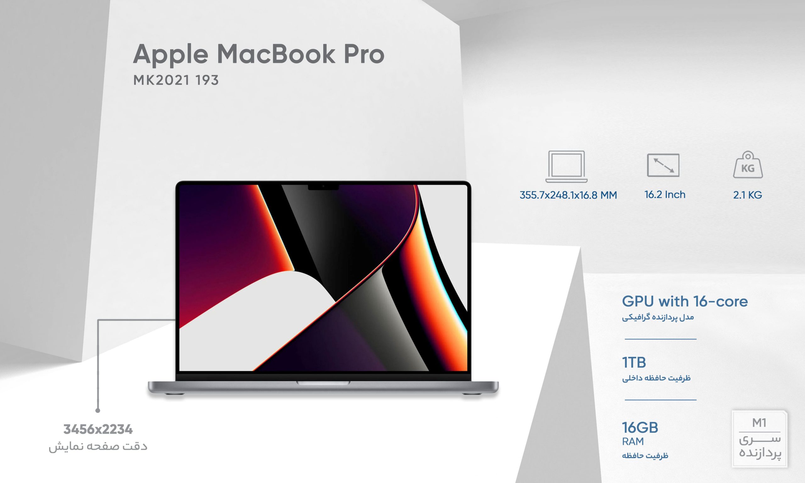 سری لپتاپهای مکبوک شرکت اپل تا به امروز بدون هیچ تعریف اضافی توانستهاند با بهره بردن از مشخصات فنی قدرتمند، عملکرد بسیار خوب و قابل قبولی را ارائه کنند. یکی از لپتاپهای قدرتمند این سری، مدل MacBook MK193 2021 است. این لپتاپ به صفحهنمایش با ابعاد 16.2 اینچی با رزولوشن 2234×3456 پیکسل از نوع Liquid Retina XDR مجهز شده است که توانایی نمایش 254 پیکسل در هر اینچ را دارد. باید بگوییم که با توجه به مشخصات در نظر گرفته شده، با صفحهنمایش قدرتمند و بسیار باکیفیتی روبهرو هستیم. اما مشخصات قدرتمند این صفحهنمایش تمام نشده و باید بدانید که توانایی ارائه نرخ بروزرسانی 120 هرتز را دارد که صفحهنمایش روان و بدون هیچ لگی را برای شما به ارمغان میآورد. اما بدون شک اصلیترین مشخصه لپتاپهای سری مکبوک شرکت اپل، پردازندههای در نظر گرفته شده است. MacBook MK193 2021 هم به پردازنده قدرتمند Apple M1 Pro مجهز شده که توانایی ارائه عملکرد بسیار خوبی در اجرای نرمافزارهای کاربردی و سنگین دارد. وزن مناسب 2.1 کیلوگرمی این لپتاپ هم سبب شده تا مشکلی برای جابهجایی با خود بههمراه نداشته باشد و ابعاد مناسب و جمع و جور MacBook Pro MK193 2021 هم فضای چندانی را اشغال نمیکند.